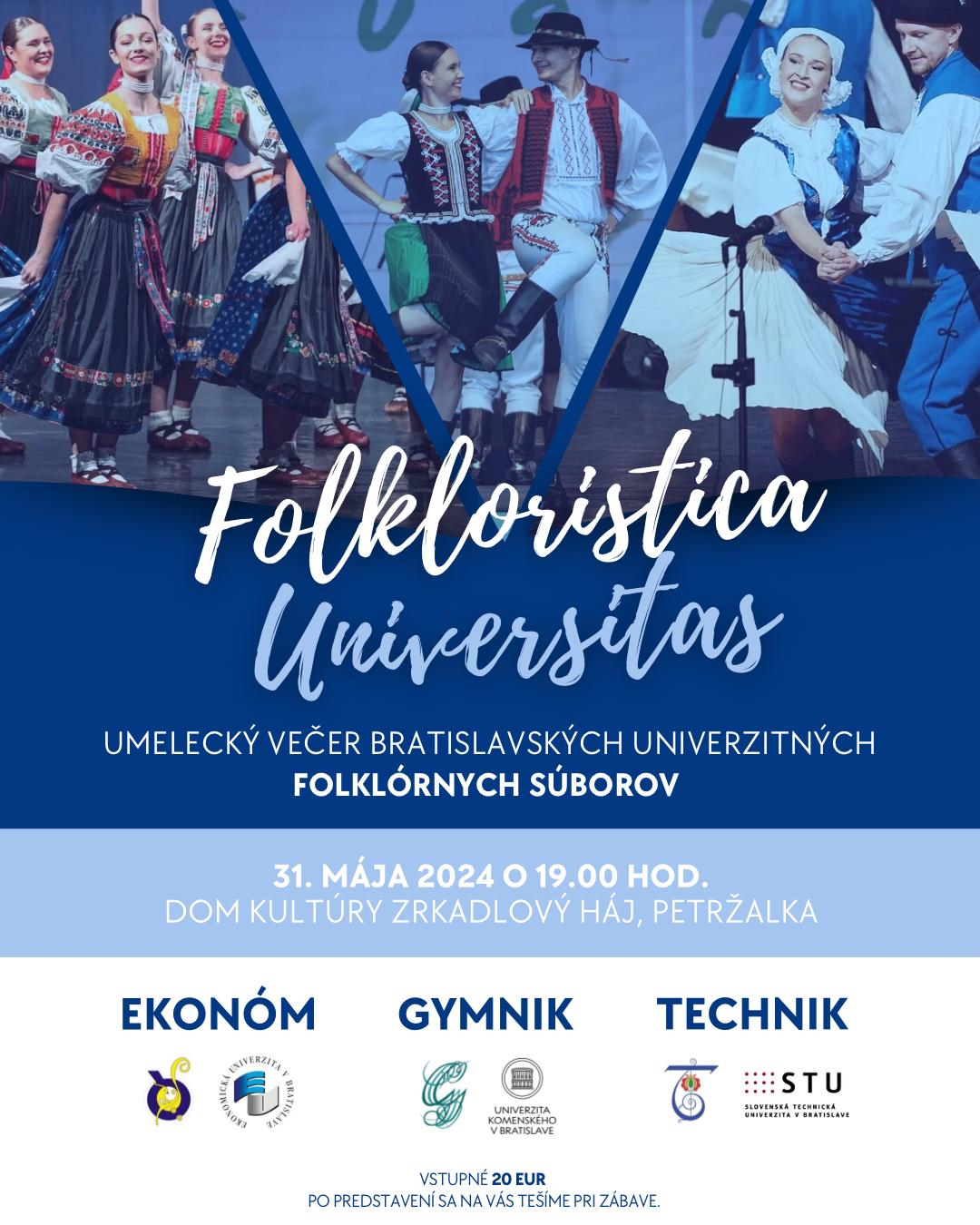 Roky na vysokej škole sú obdobím, počas ktorého disponujeme relatívne veľkým množstvom energie a entuziazmu. Ostaň študovať na Slovensku a staň sa súčasťou študentskej folklórnej komunity. Pozývame ťa na umelecký večer bratislavských univerzitných folklórnych súborov Folkloristica Universitas. Spoznáš Folklórny súbor Ekonóm Ekonomická univerzita, Folklórny súbor Gymnik Univerzita Komenského, Folklórny súbor Technik Slovenská technická univerzita.